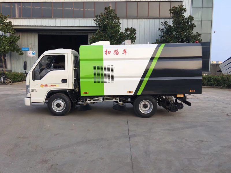 该扫路车采用福田小卡型二类底盘改装,加装副发动机、风机、清水箱、垃圾箱、左右立扫、后置吸盘,扫盘降尘系统,液压系统、专用装置电控系统和副车架等改装而成。